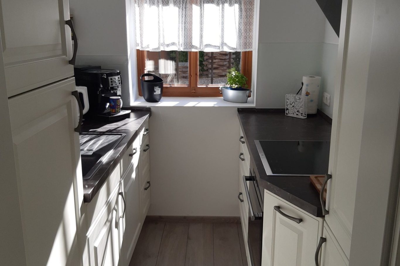 Voll ausgestattet mit hochwertigen Geräten, inklusive Kaffeevollautomat und Spülmaschine.